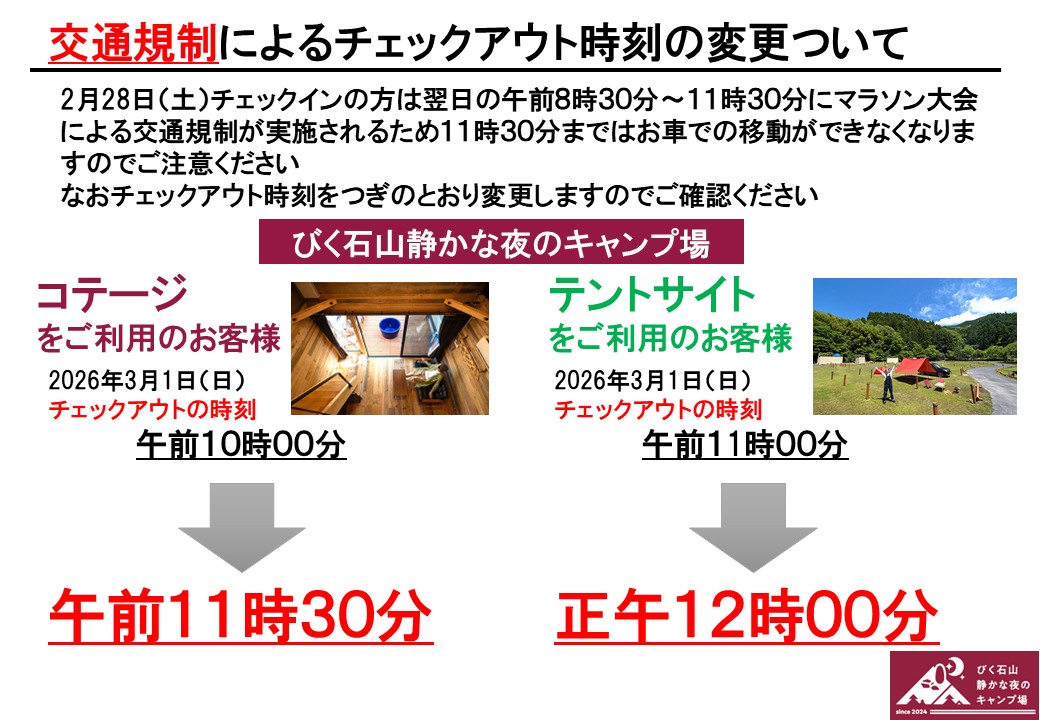 2月28日(土)チェックインの方は翌日の午前8時30分~11時30分にマラソン大会による交通規制が実施されるため11時30分まではお車での移動ができなくなりますのでご注意ください